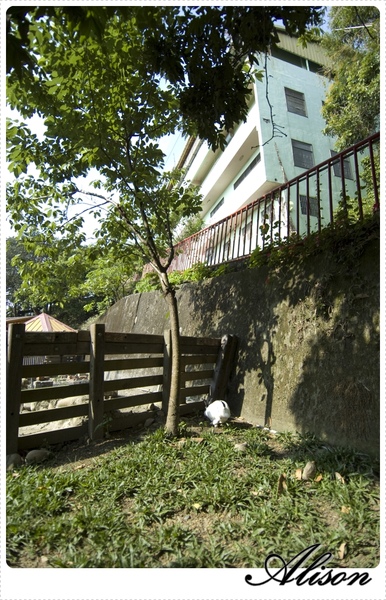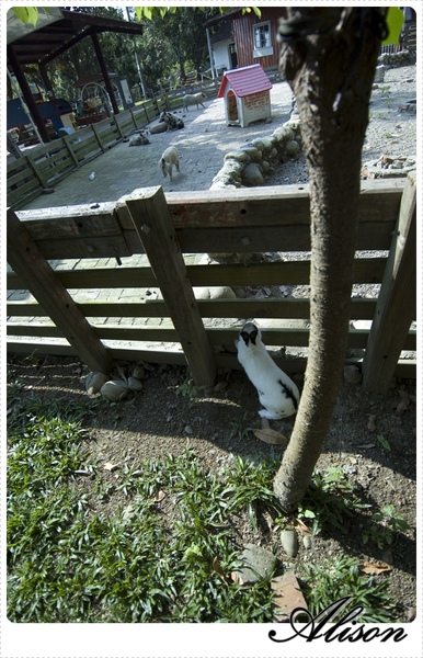 吃飽後帶他到迷你豬區旁去玩,今天沒有豬在外頭遊盪,他可以自在的跳.