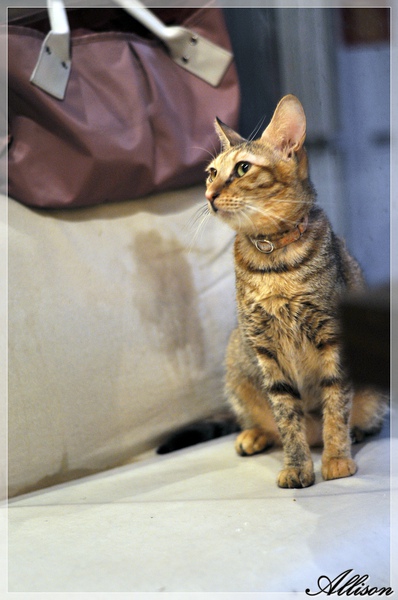 這隻好像叫阿嬌,他都坐在靠近門邊的沙發上,二天看到他都是在那裡,哦上頭的那個小b包包,就是被貓兒翻過的主角XD。