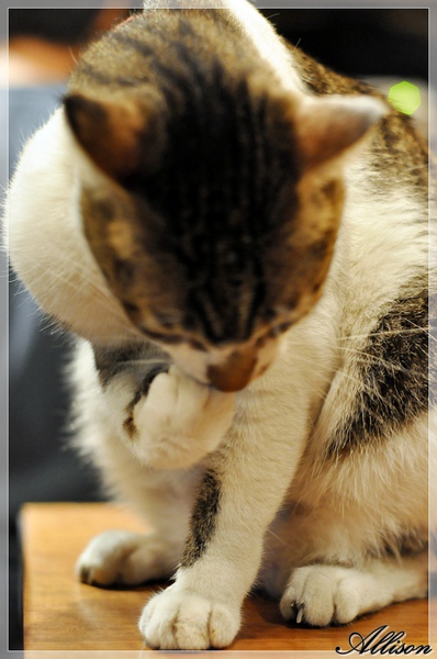 這隻是小美,雖然他的花色也不漂亮,但是他也很乖~他偶爾會坐在沙發的靠背上頭。