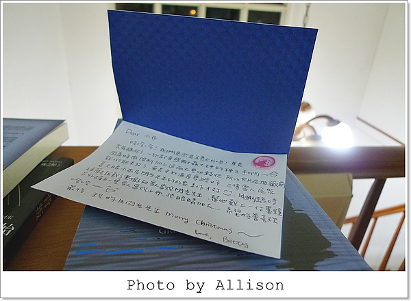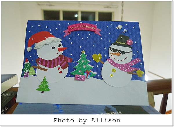 小布收到的卡片,是手作的,整個就是很感動,而且雪人還是做成了小布的大眼跟閃光先生的樣子(閃光=墨鏡)哈~超細膩的說。