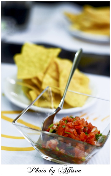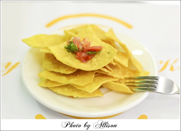 100元的券可以換得一份點心有原味薯條/辣味契型脆薯/洋蔥圈/沙拉/墨西哥脆片(5選1),小布選的是墨西哥脆片,洋玉片+蕃茄沙沙醬?有很重的香菜味,帶點微微的辣,還滿特別的。
