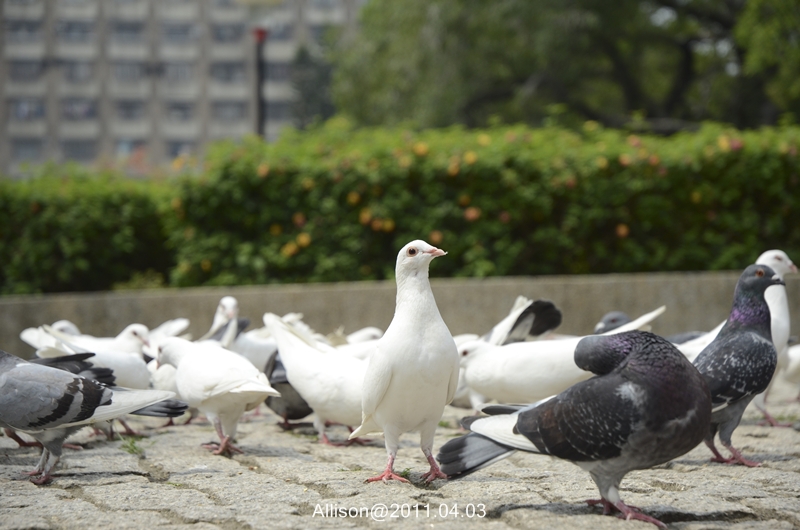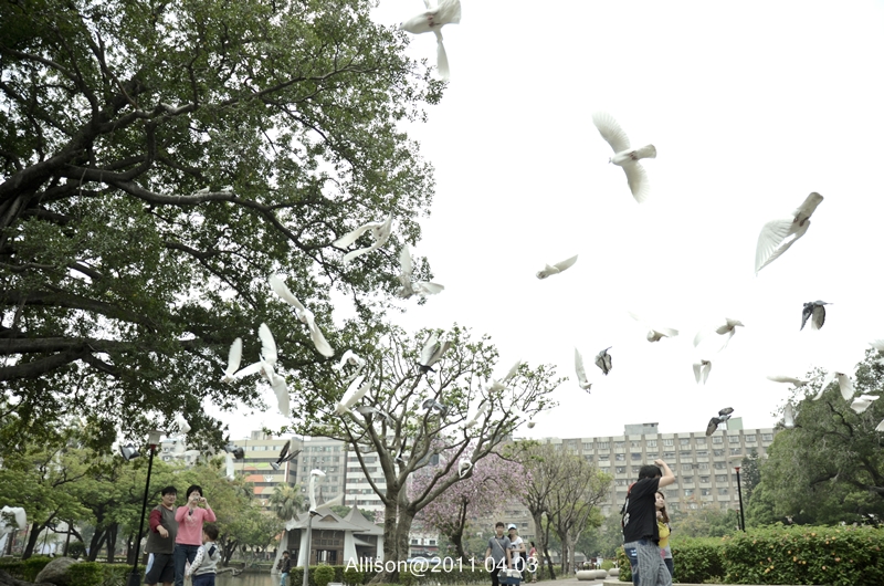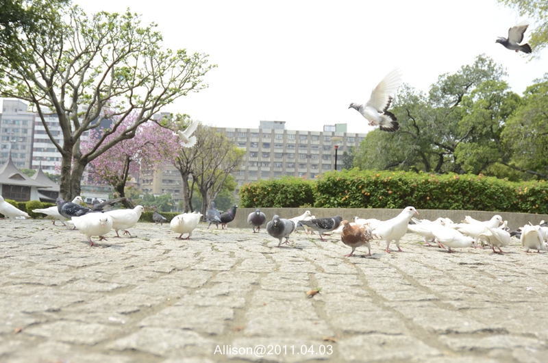 往裡頭走,鴿子正在享受著阿伯帶來的大餐,一隻隻紛紛的飛過來,於是我跟閃光先生就坐在餵食鴿子的阿伯身旁地上,想拍一些鴿子的照片。