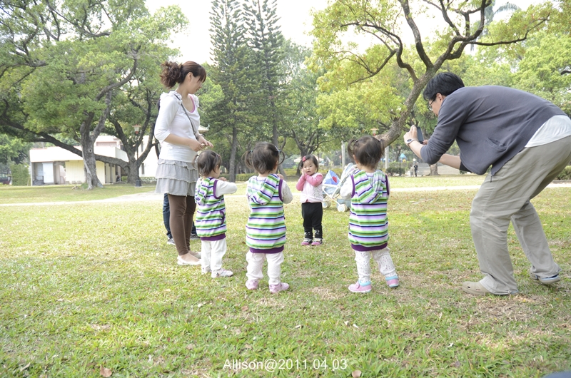 沒想到閃光先生竟然發現有三個小妹妹,都穿著相同的衣服,很好奇的我們往前去看,是三胞胎喔,不過因為沒有經過爸媽的同意,所以就放個背面給大家看吧!!小布還是頭一次看到三胞胎呢~這三胞胎還遇到了雙胞胎妹妹,二對互看還別是趣味的呢~~
