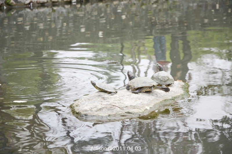往旁邊的荷花池,看到了不少隻的烏龜及魚,照片中的烏龜,還用一種特殊姿勢在晒太陽,右腳抬起來,這不曉得是哪一招。