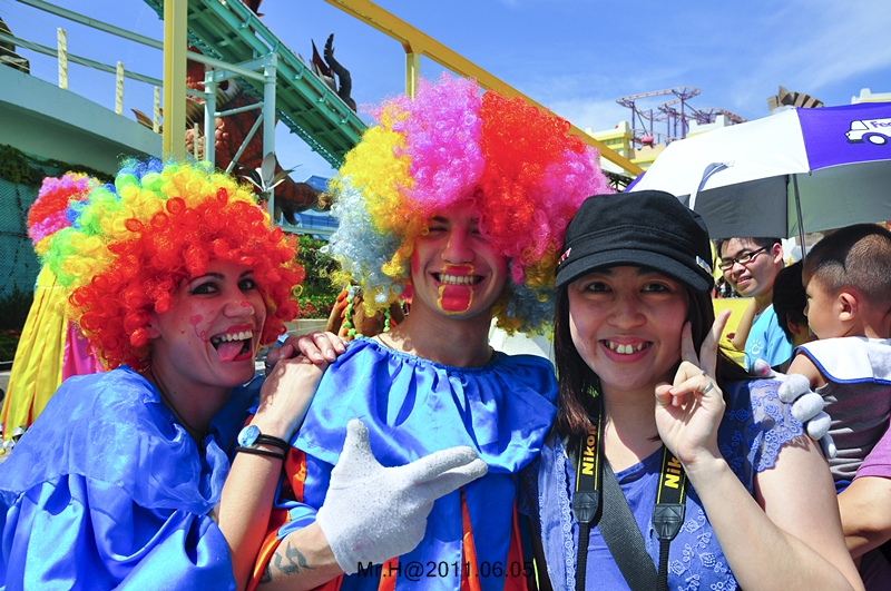 走出特洛伊城後實在是很熱,所以一出來就是直奔〔太陽城〕裡去吹冷氣,太陽城主要是販賣紀念館的,另外也有冰淇淋及飲料,天氣熱一行人幾乎要人手一支了,這時我們在這裡等待著PM2:00的馬戲嘉年華遊行,這遊行中有很多都是外籍的表演者,而且相當活潑,看有人想拍照還會湊過來拍,不過這二個小丑是有發現小布伸出了手要拉他,所以就跑來跟我一起合照了XD。