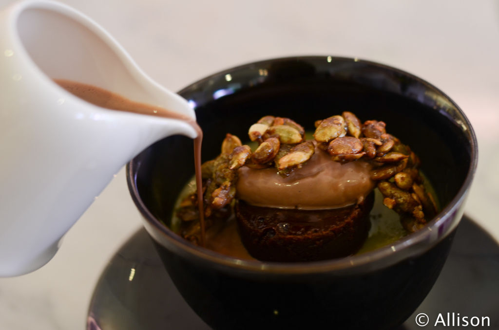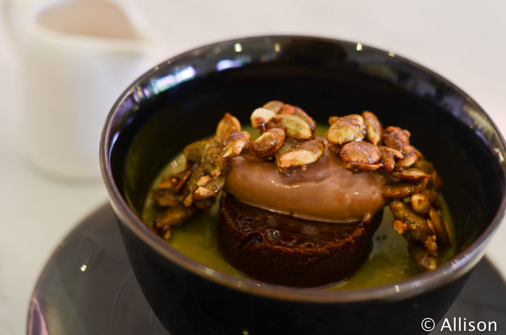 挖了一匙放入口中,好濃郁的堅果味,好香好香,熱巧克力不是甜的,也不苦,但是就帶著柔順的口感,好好吃喔∼怎麼會那麼好吃!!!讓我好驚艷,又挖了一匙上方的巧克力,很像是巧克力泥卻很濃,像布朗尼,又太綿密,不曉得怎麼形容,但也是相當美味,上方的奶油也很清香,上方的酥脆開心果,甜甜的酥酥脆脆,整體就是很豐富的口感。