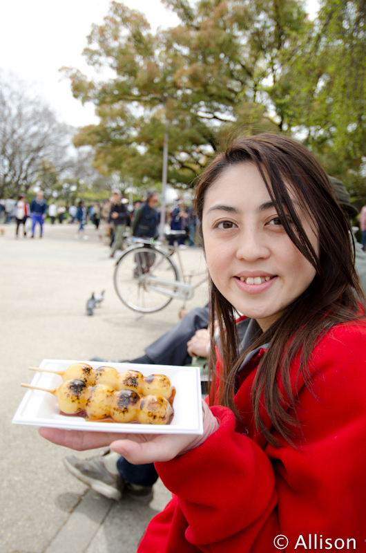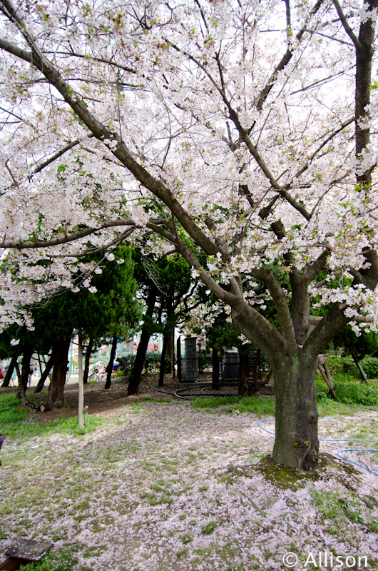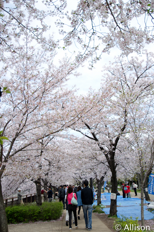 不過在靠近入口前的櫻花大道,還是有盛開的櫻花樹,沒有讓我們這一趟來的白費,一早有不少的藍色野餐墊已經準備好了,看來待會兒會這裡會有一場賞櫻﹠美食的宴會。