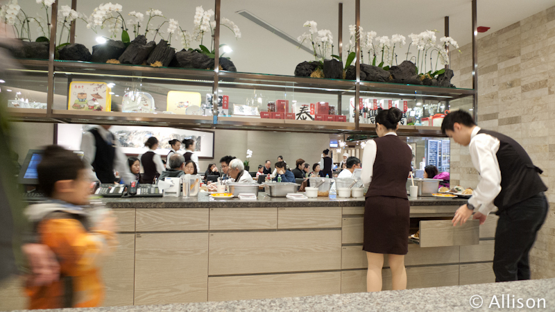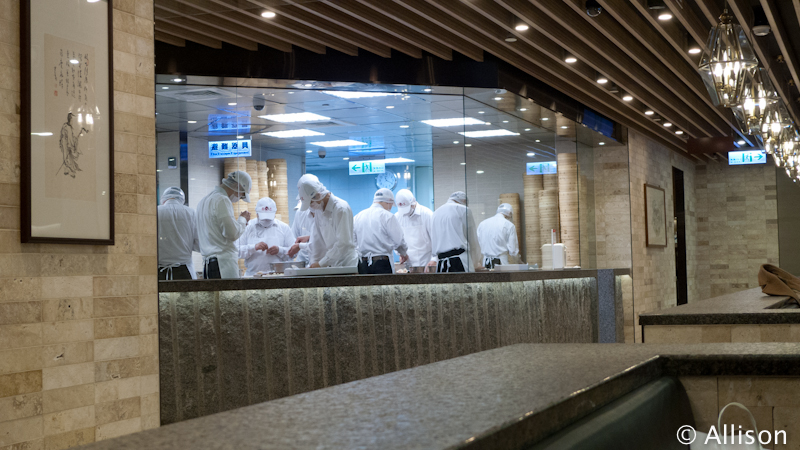 一如其他的分店,他們有開放式的廚房,讓大家看裡面的包餡工作,我還滿喜歡站在前面看的說~不過101這間的開放式廚房是在餐廳裡面,如果在外面等是看不到的,話說鼎泰豐的外場服務生是不是都有選過丫!!每個都超級瘦的,另外都有很親切的笑容,女服務生占多數,我只有看到一個男服務生說(也是瘦到不行)。