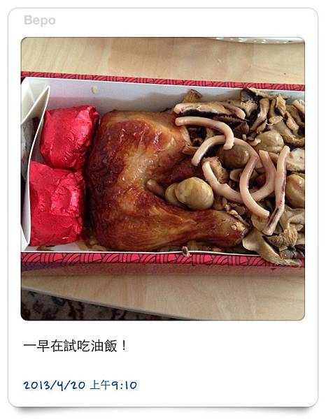 油飯的話,我是訂了吉贊油飯,雖然名聲沒有像狀元及太子那麼大,但因為先前在網站做功課時,有網友說吉贊還不錯吃,因此打了電話去索取了試吃,吉贊很大方的給坐月子的產婦試吃了十六兩的招牌油飯(免費),用料十分大方,使用烤雞腿而不是炸雞腿,吃起來有少油許多,另外還有栗子跟魷魚,由於是16兩份量十分大,大概二人可以分食,本來小布是打算訂12兩的,但當天拿到試吃時,閃光先生跟布媽都說十六兩好,所以我們最後訂了十六兩(事後真的覺得太大了)。