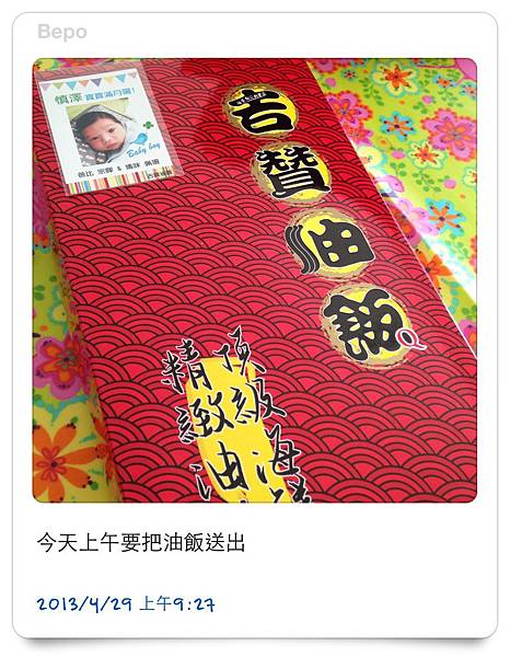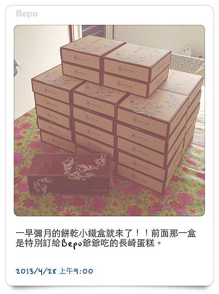 4/29BEPO滿月了,我們聽從BEPO阿祖(閃光先生外婆)的話,彌月是在BEPO農曆滿月前一天做,這天閃光先生還請了假,因為要去送油飯,而前一天的星期日則請小布的朋友上來林口領取彌月禮盒,BEPO的彌月小布使用了餅乾及油飯二種禮盒,原本以為數量不會太多的,結果訂起來也是相當的可怕,全部訂了73盒(但像小布的外婆及舅舅姨姨們我就沒有給了,因為外婆說太麻煩他不想要,連同舅舅姨姨們的他都懶的收,因為外婆獨自在家行動又不方便,所以也就沒有再跟外婆討價還價)