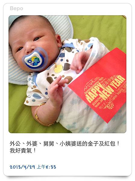 有聞滿月時娘家必須準備全套的嬰兒衣服,然後頭上要縫金飾之類的,但因為BEPO衣服己經不少了,所以就從簡直接準備日後可以穿戴的金鍊子,而手上的小手鍊是他舅舅(布弟)送的。