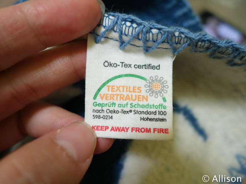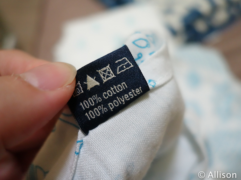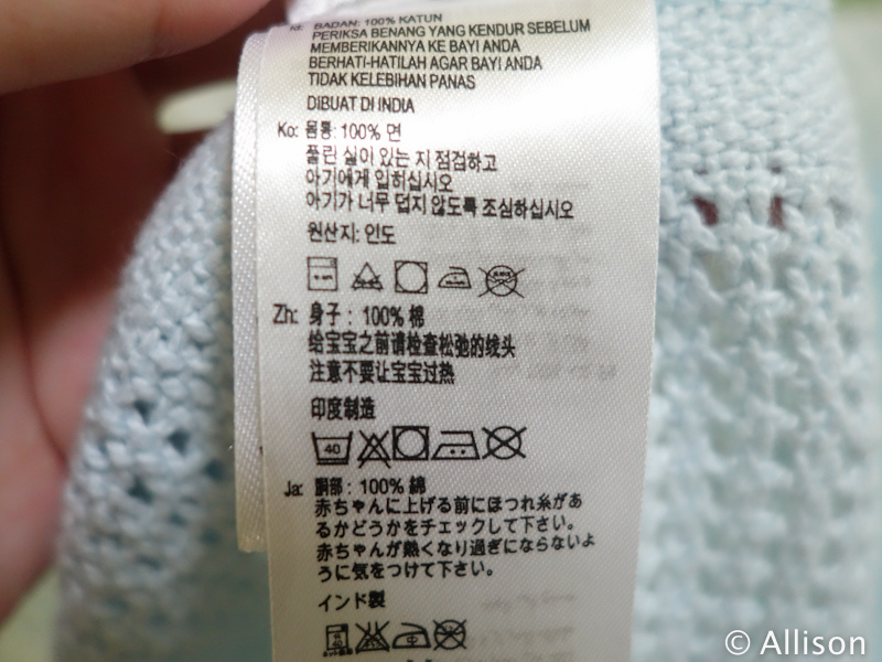 產地是印度製,100﹪的棉,有爬文看過有些媽媽說這條很容易有棉絮,但我自已沒發現耶~~不過友人說多洗幾次就OK了!!