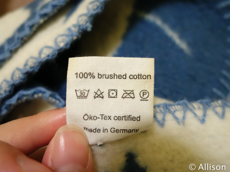 材質是100﹪的綿,產地是德國,仔細看他的邊都是有另外用綿線織邊。