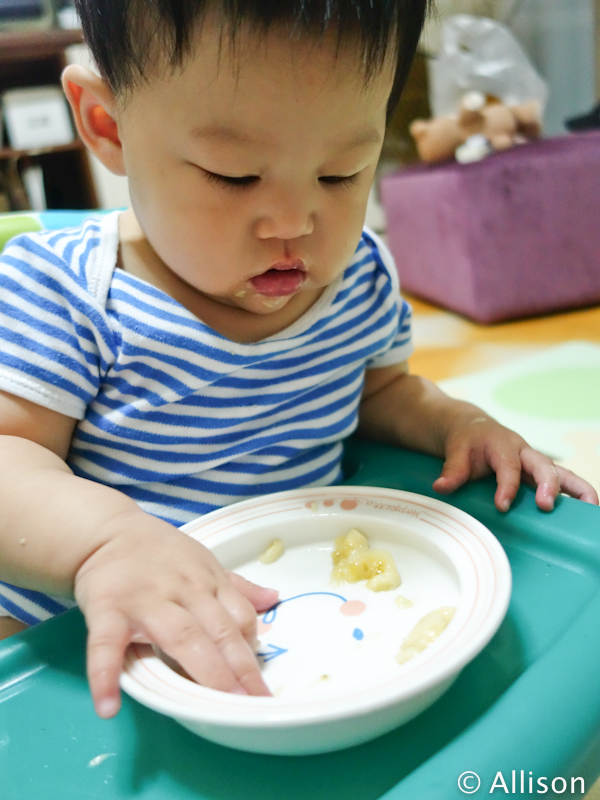 香蕉其實對小朋友來說超難拿,因為很滑,結果盤子就變成是BEPO掉下來時盛接的地方了(總比掉在餐椅盤上好吧)
